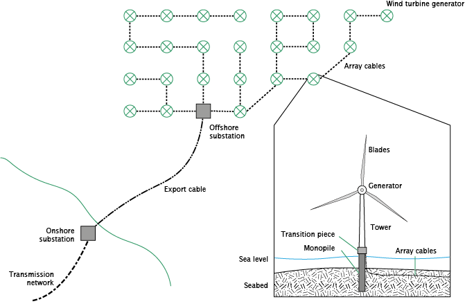 Wind is created from a differential in air pressure between two locations, causing air to flow from areas of high pressure to regions of low pressure. This kinetic energy can be harnessed through wind turbines in order to generate electrical energy. Wind energy has been one of the fastest growing sources of renewable energy. In the UK alone, there are c. 1000 wind projects representing an installed capacity of c. 13.5 TW, generating in excess of 30 kTWh per annum. Broadly, projects are divided into onshore and offshore wind farms. Onshore turbines connect into the existing distribution network and can range upwards from a single turbine to large farms. Offshore projects are more complex, requiring more advanced engineering techniques to install turbines on the sea bed, as well as the installation of see floor cables to connect the offshore farm to the land. As a result, offshore projects tend to be more capital intensive and larger than their onshore counterparts. An example of an offshore wind project layout is shown below.